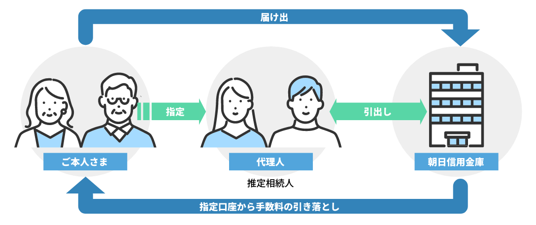 「代理人」を指定していただくことで、窓口に行けない場合でも代理人が代わってお取引していただけます。