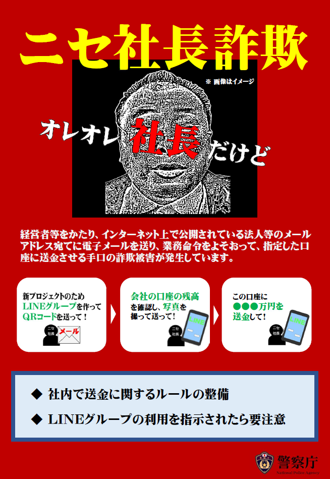 現在、経営者等になりすましてインターネット上で公開されている法人等のメールアドレス宛てに電子メールを送信し、SNSグループやLINEグループの作成を指示した後、業務を装って指定した口座に送金させるなどして金銭をだまし取る、いわゆる「ビジネスメール詐欺」が発生しています。