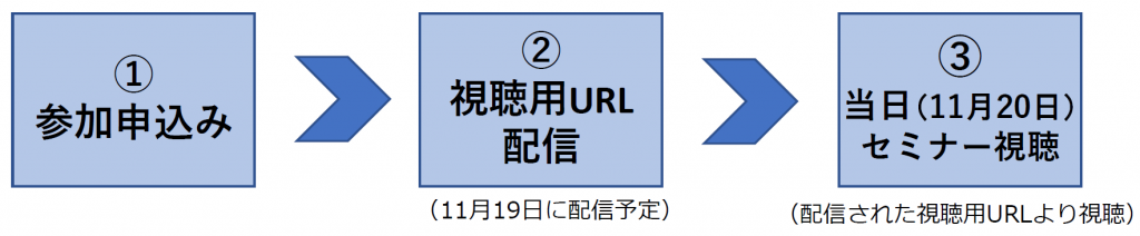 視聴を希望される場合、事前のお申し込みが必要となります。参加お申し込み後、セミナー当日までに視聴用URLがメールで配信されますので、視聴用URLにアクセスしてご視聴ください。